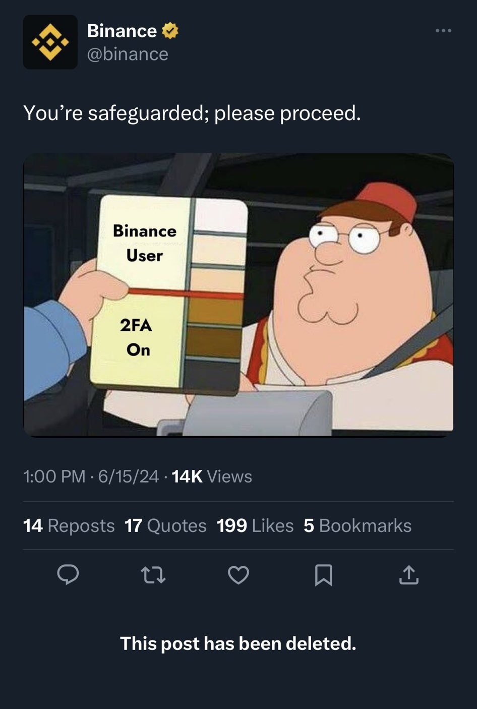 Binance edited the meme to show Binance users in the ‘light-skinned’ category and users with 2-factor authentication in the ‘dark-skinned’ category. “You’re safeguarded; please proceed,” the caption read.