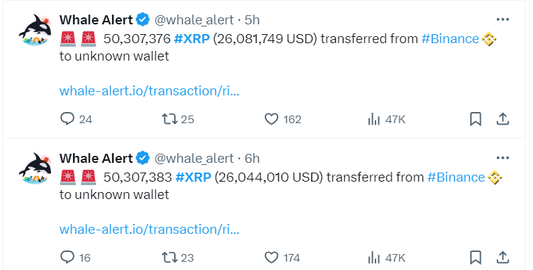 Just an hour later, another 50,307,376 XRP, worth over $26.08 million, left Binance for another anonymous wallet. Collectively, Whale Alert documented the transfer of 100,614,759 XRP valued at $52,125,759 from Binance to two anonymous wallets.
