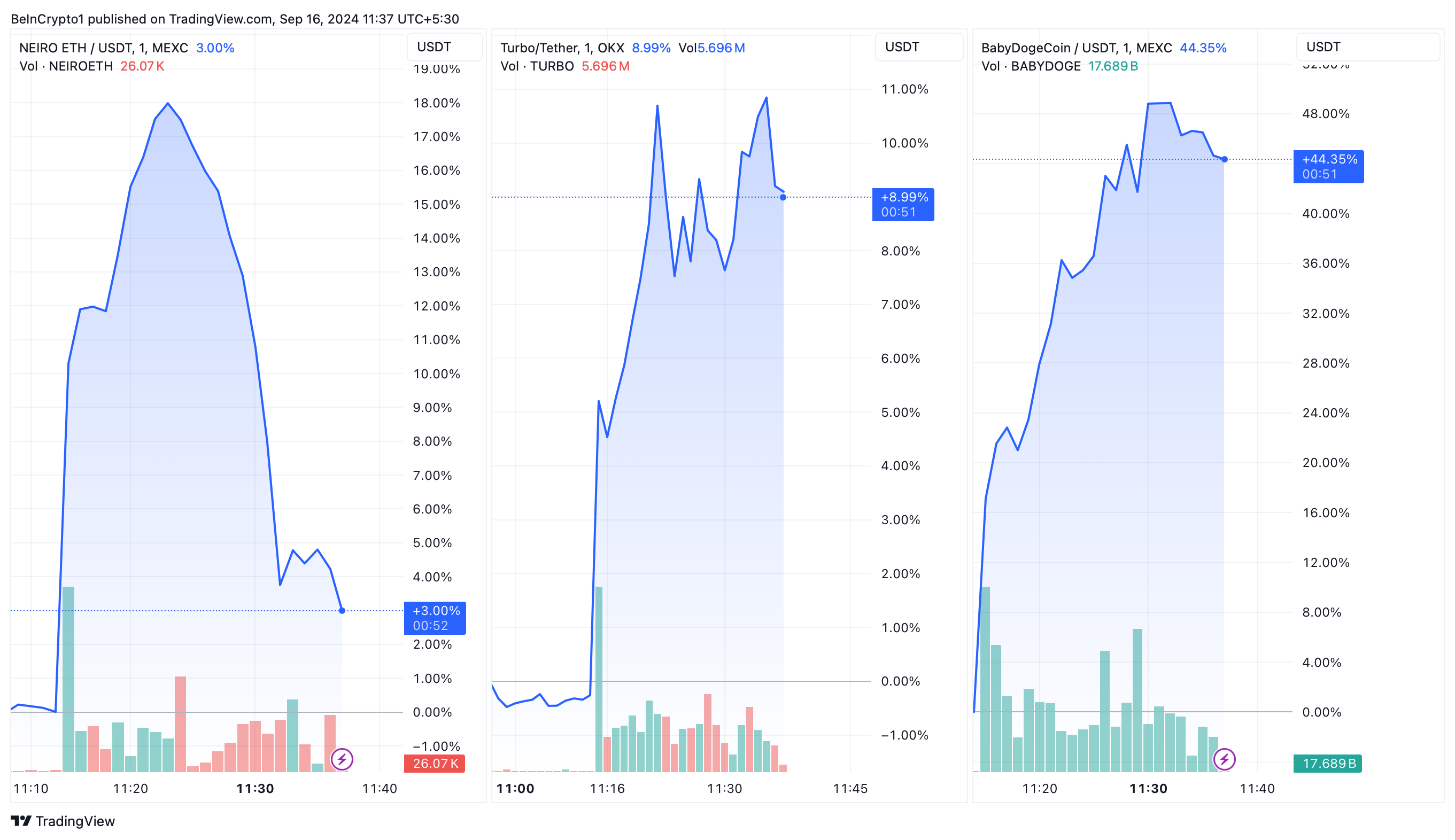 Neiro, Turbo, and Baby Doge Coin Price Performance. Source: TradingView