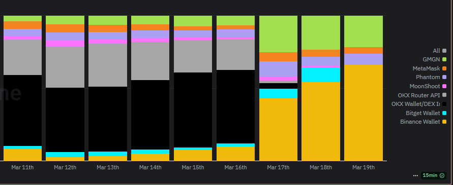 Binance Wallet expanded its influence among other Web3 wallets after adding new liquidity features. | Source: Dune Analytics