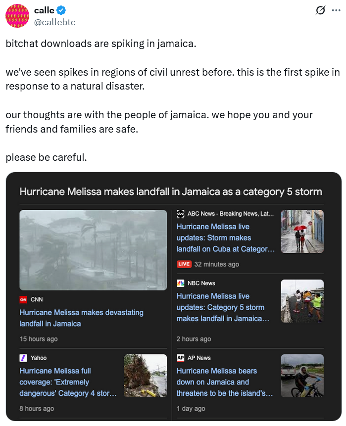 Jamaicans have rushed to download Jack Dorsey’s decentralized peer-to-peer messaging app Bitchat as the fatal Hurricane Melissa continues to rip through the Caribbean.