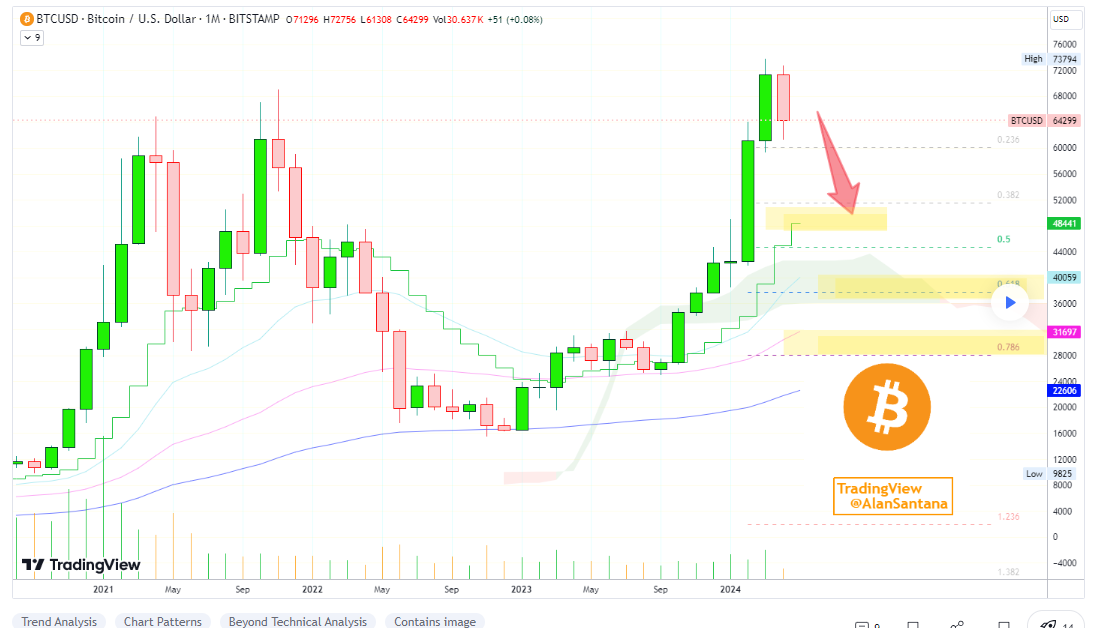 Regarding the next trajectory, crypto analyst Alan Santana pointed out in a TradingView post on April 14 that Bitcoin’s recent downturn may be just the beginning of a more substantial correction.