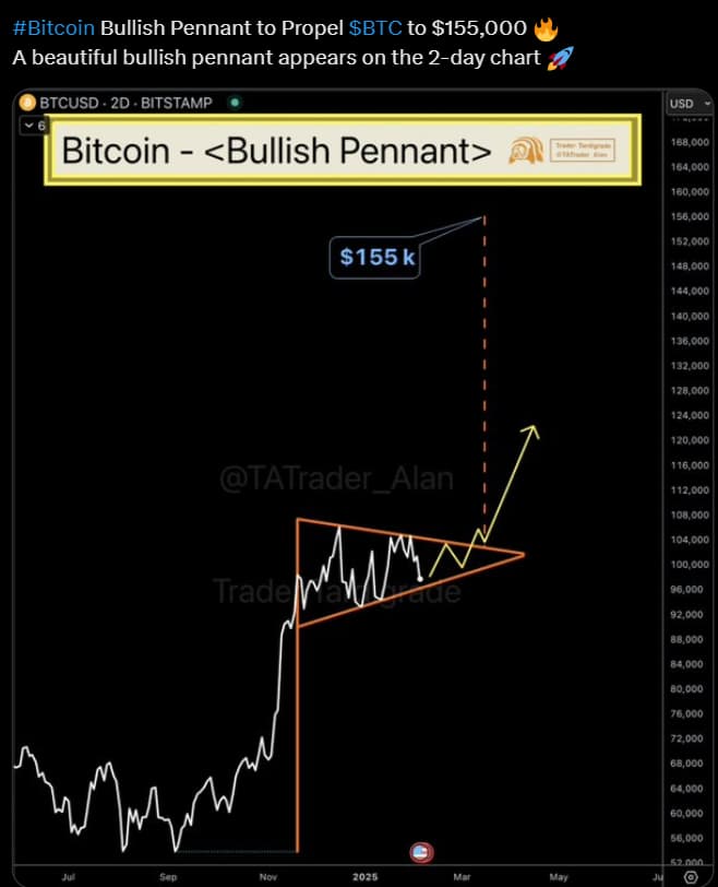 The analyst projected that if BTC confirms a breakout from this formation, it could surge toward $155,000 in the coming months.