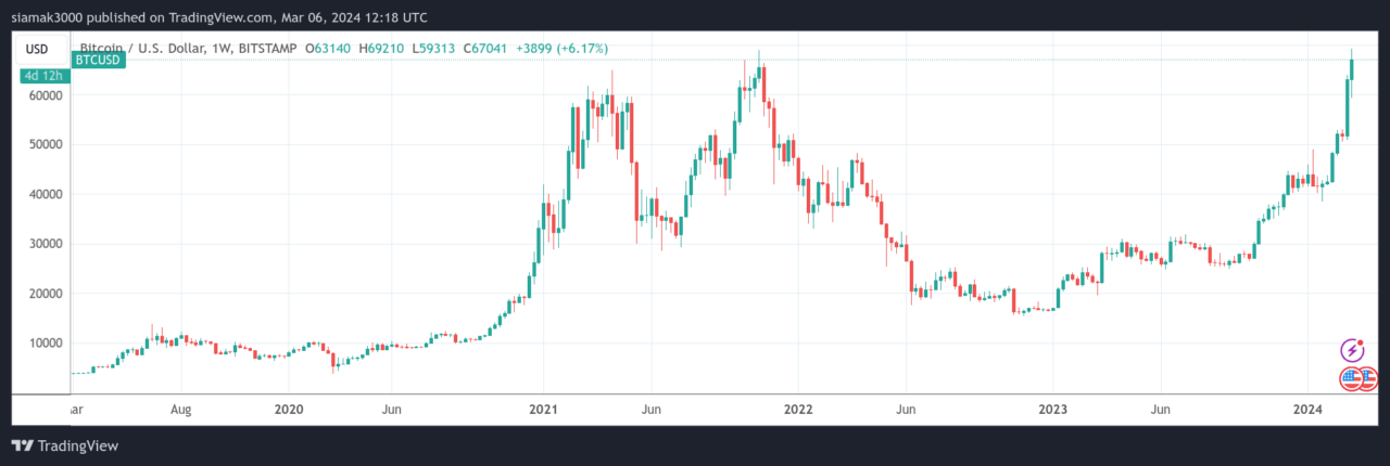 Bitcoin reached a new all-time high of $69,210 (on Bitstamp) on Tuesday, surpassing its previous record set in November 2021 during the COVID-19 pandemic. However, the cryptocurrency later retreated to trade at around $66,160 as of 12:52 p.m. UTC on Wednesday. Meanwhile, gold bullion also hit a new peak of $2,141.79 an ounce on Tuesday, exceeding its previous high from early December. Henderson notes that the precious metal has gained almost 5% over the last five sessions.