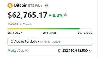 Bitcoin nearing the $63k level today. Source: Coingecko