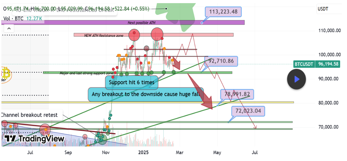 The analyst also noted a scenario of Bitcoin picking up buying momentum and catapulting off the $93,000 support level. If the $93,000 support level holds, Bitcoin may gain momentum for another rally toward a new all-time high. In this scenario, the analyst highlighted a rally towards a new all-time high target zone around $113,220.