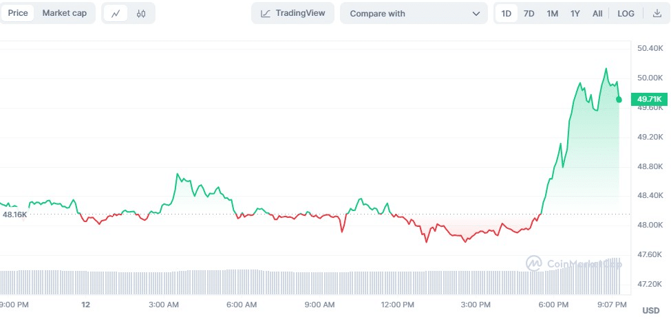 At press time, BTC was trading at $49,763, up 3.40% from the intra-day low. Concurrently, the market capitalization and 24-hour trading volume surged by 3.37% and 53.93% respectively to $975,622,225,763 and $31,647,716,268.