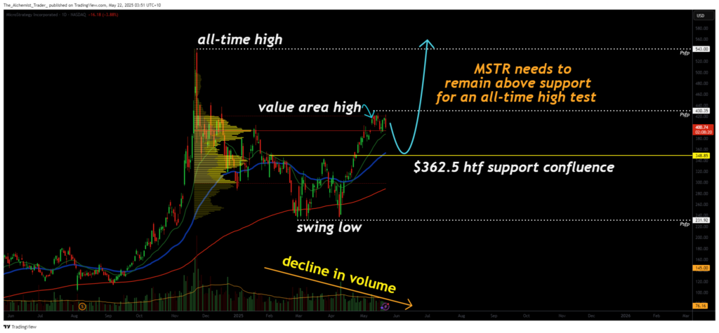 Strategy is forming a bullish setup similar to Bitcoin’s recent breakout. With price testing resistance, a potential pullback to strong support could trigger a move into all-time high territory.