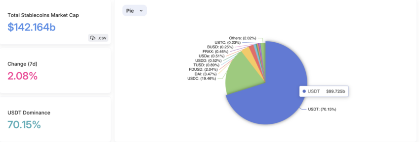 Tether is on the brink of reaching a $100 billion market cap. Its dominance in the stablecoin market is clear, with over 70% market share, according to DefiLlama.