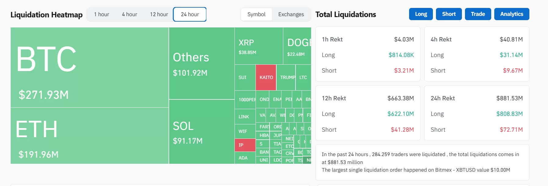 This decline left investors with leveraged positions in a bind. According to Coinglass data, $881 million worth of leveraged positions were liquidated in the last 24 hours. $808 million of this was long positions and $72.7 million was short positions.