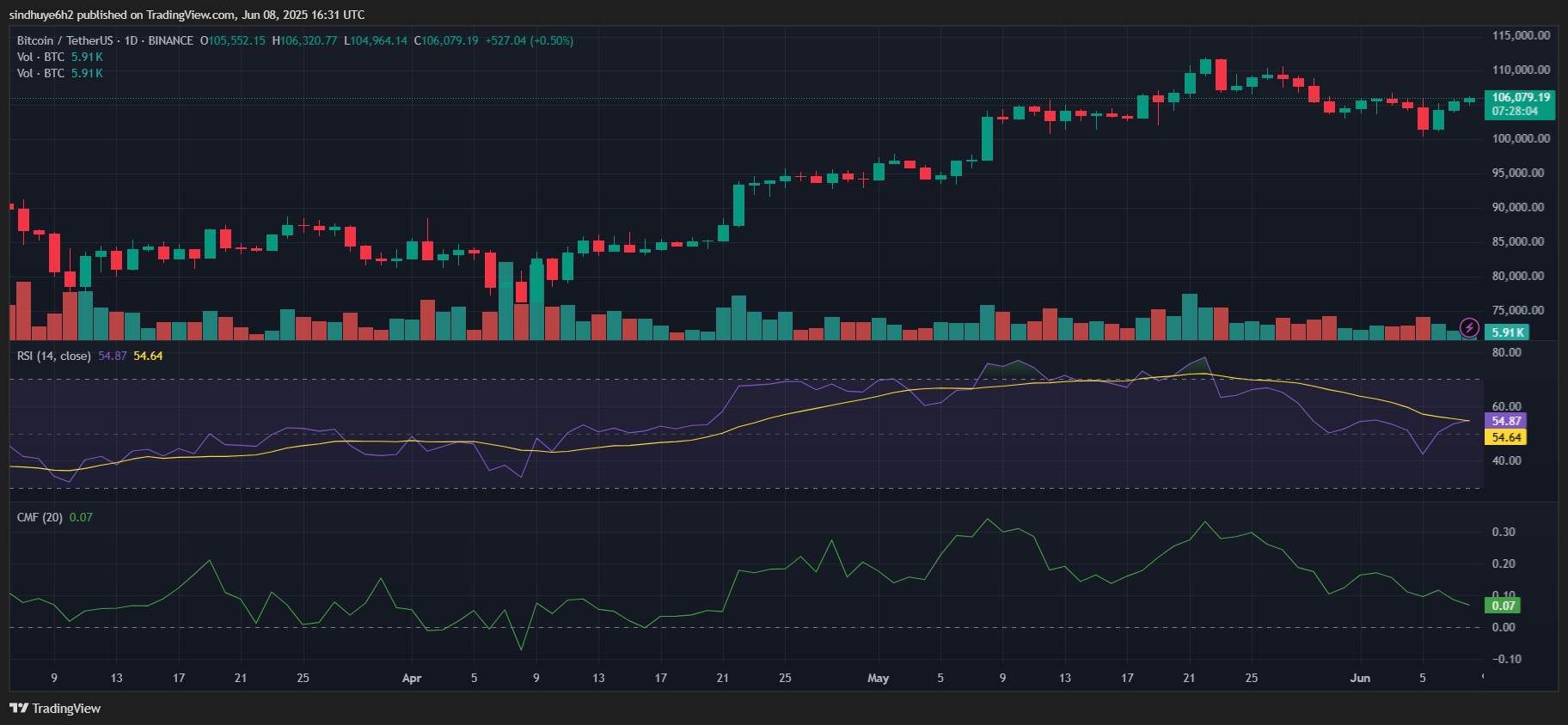Bitcoin reclaimed the $106,000 mark today, touching an intraday high of $106,039. At press time, BTC trades at $106,144.42, showing a mild 0.52% gain over the last 24 hours. Despite this uptick, the 24-hour trading volume declined by 5.65% to $37.13 billion.
