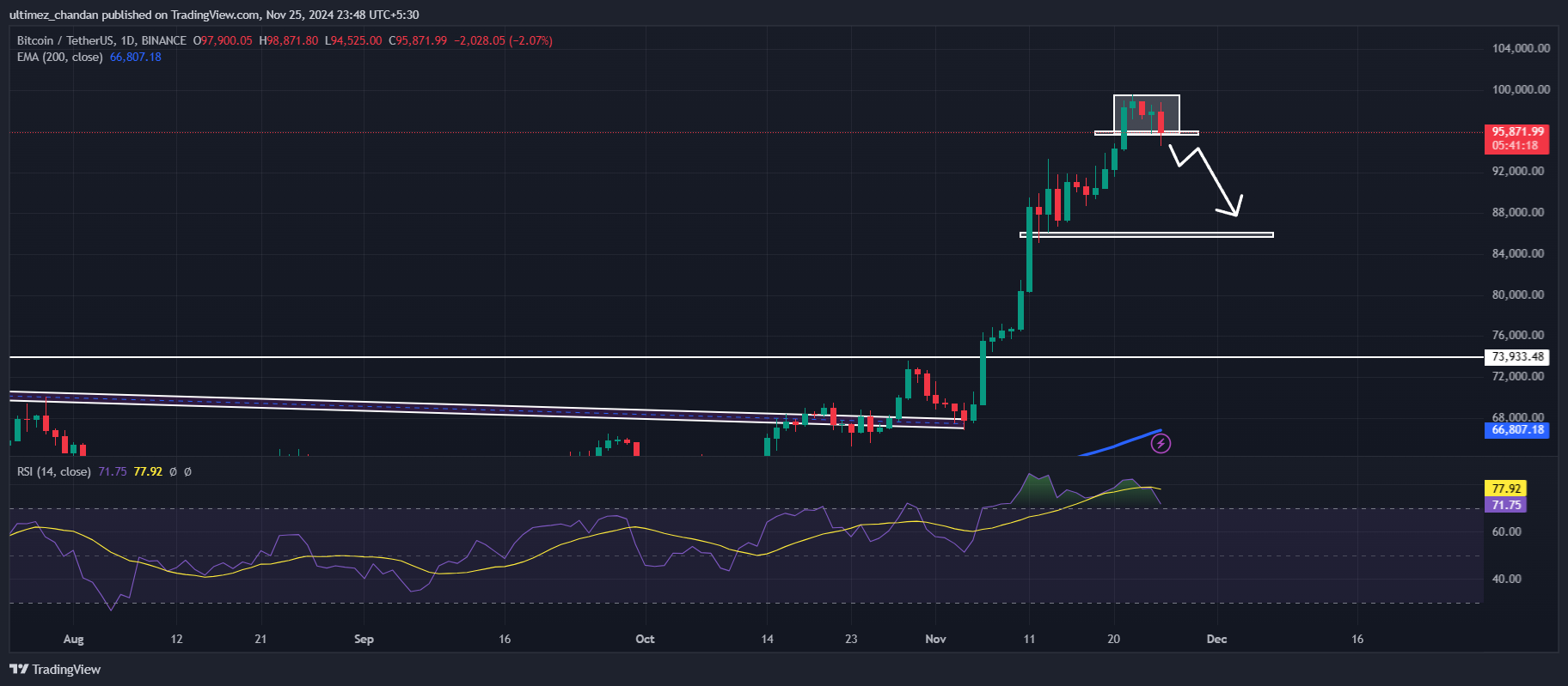 According to CoinPedia’s technical analysis, BTC has breached the lower side of the consolidation zone and has started moving downward. Based on recent price action, if BTC closes a daily candle below or near the $95,000 level, there is a strong possibility it could decline by 10% to reach the $86,300 level in the coming days.