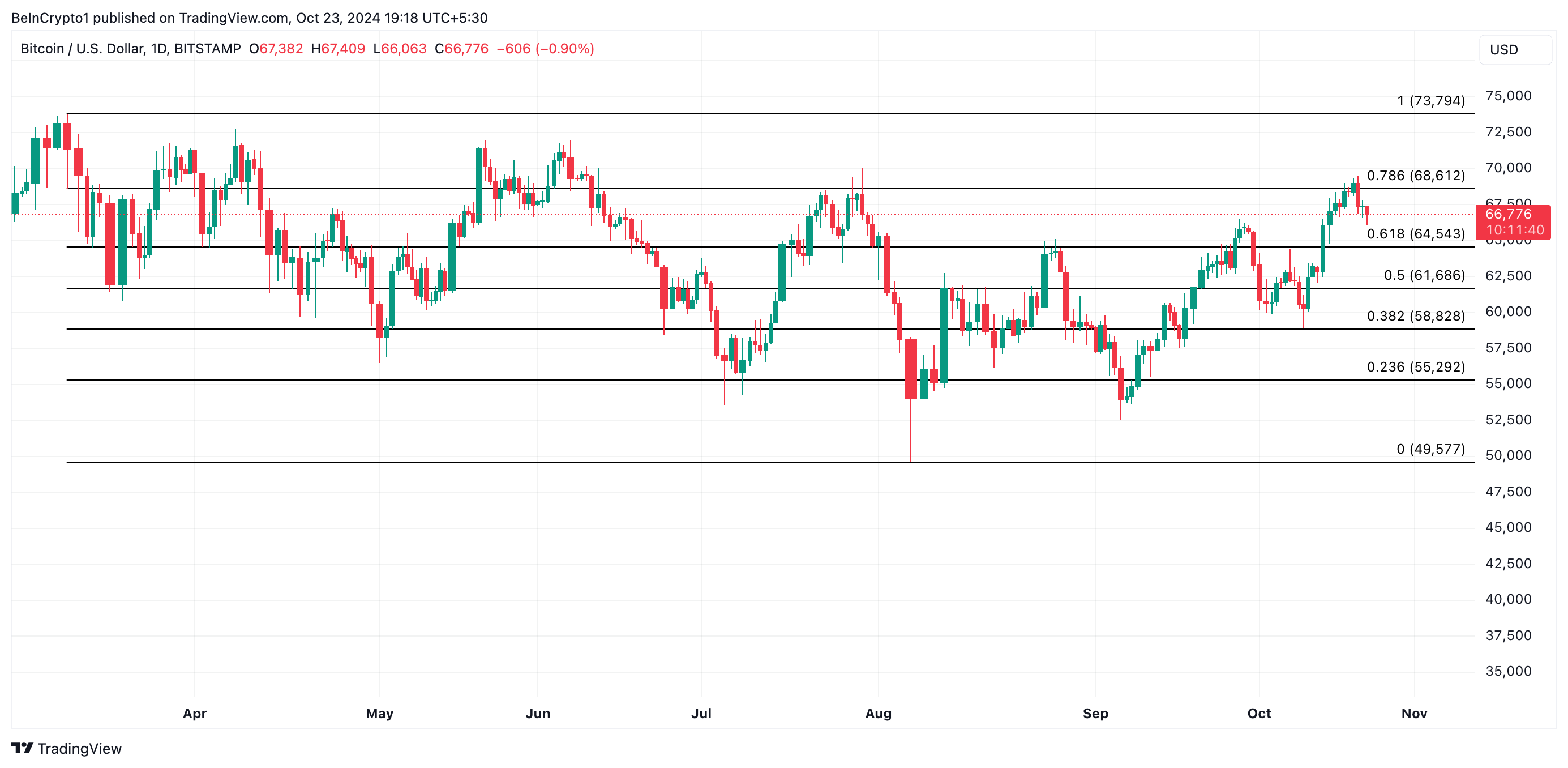 As of this writing, Bitcoin is trading at $66,776. This is just above the previous resistance level of $64,543, which it recently flipped into support.