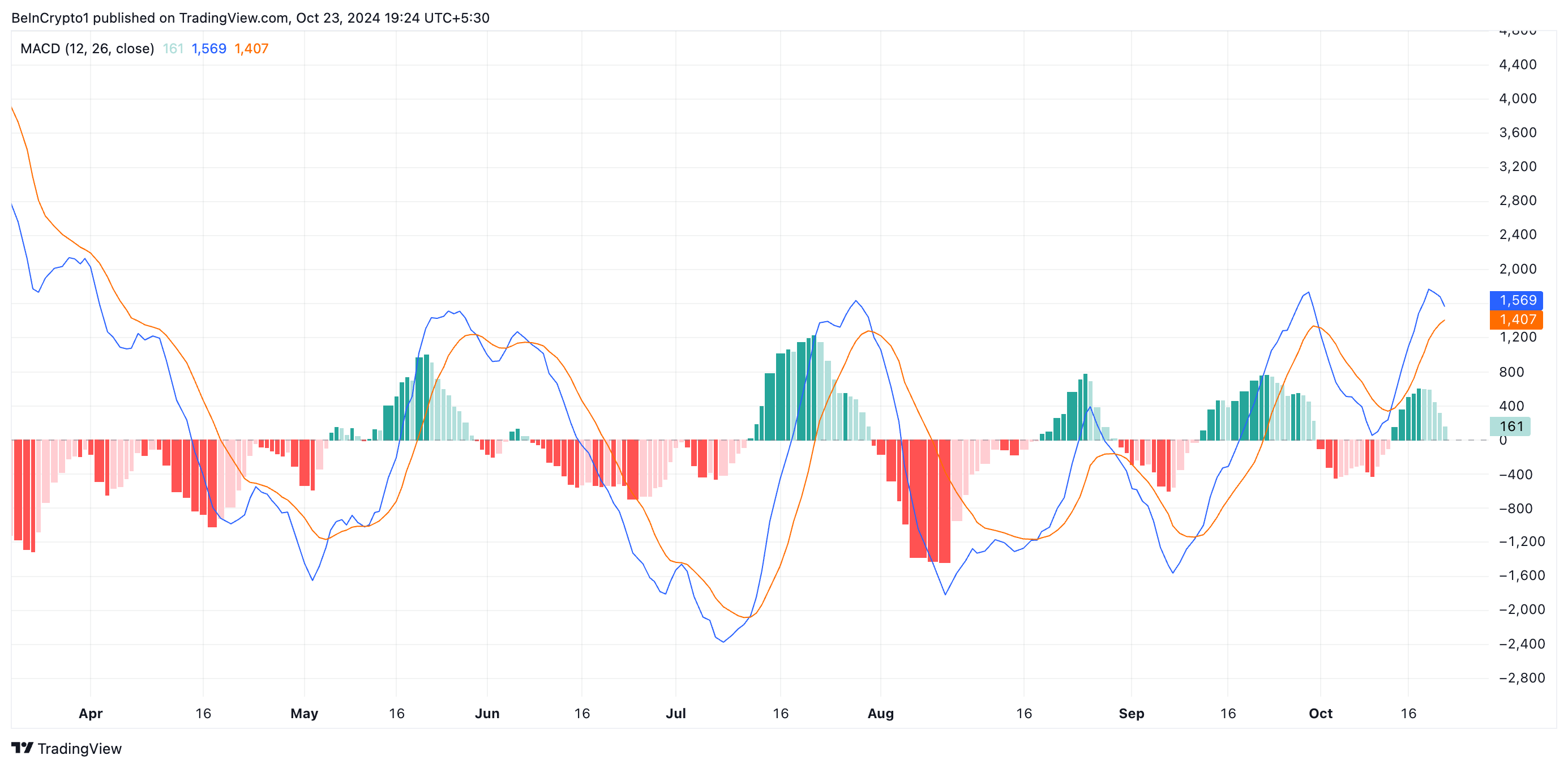 BeInCrypto’s assessment of its momentum indicators has revealed the gradual growth in bearish sentiment toward the leading coin. For example, readings from its Moving average convergence/divergence (MACD) show its MACD line (blue) poised to cross below its trend line (orange).