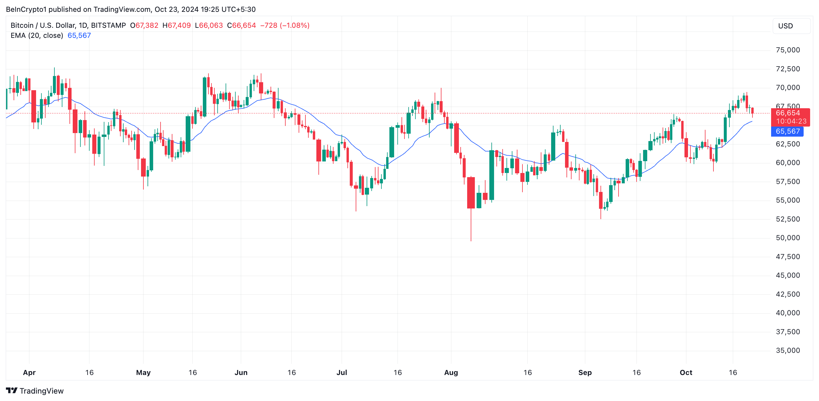 Bitcoin’s price is falling toward its 20-day exponential moving average (EMA), which measures its average price over the past 20 trading days.