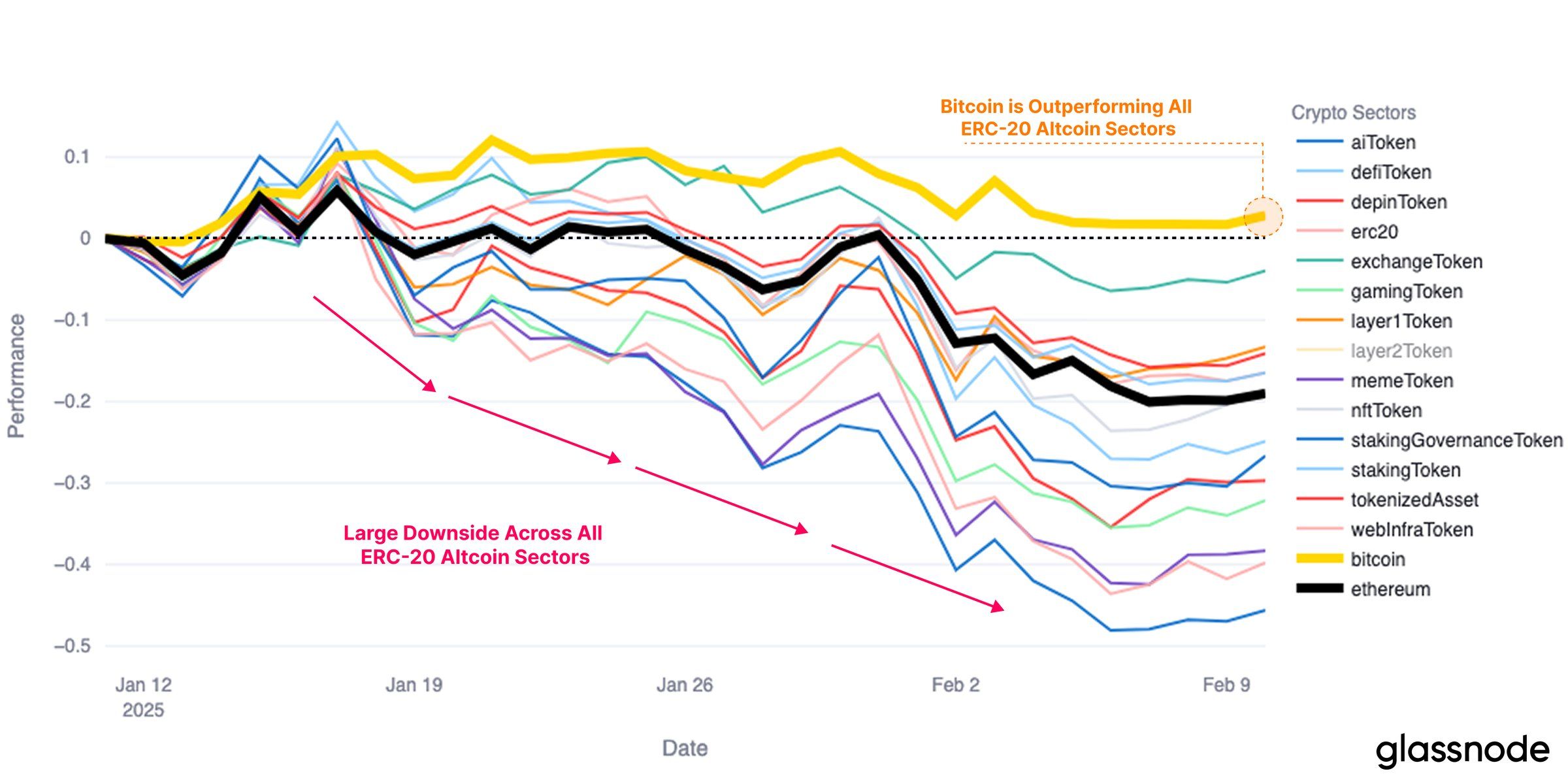 In recent weeks, Bitcoin has managed to stay near its starting position despite the overall market volatility. While altcoins, particularly those in the ERC20 sub-sector, have faced significant selling pressure, Bitcoin has shown resilience. This relative stability is a positive indicator, demonstrating Bitcoin’s strength amid broader market weakness.
