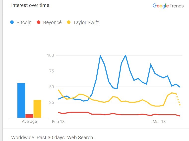 As the price of the flagship cryptocurrency Bitcoin ($BTC) surged to a new all-time high above the $73,000 mark earlier this month, interest in the cryptocurrency on internet searches also surged, eclipsing pop music titans Taylor Swift and Beyoncé in Google popularity.