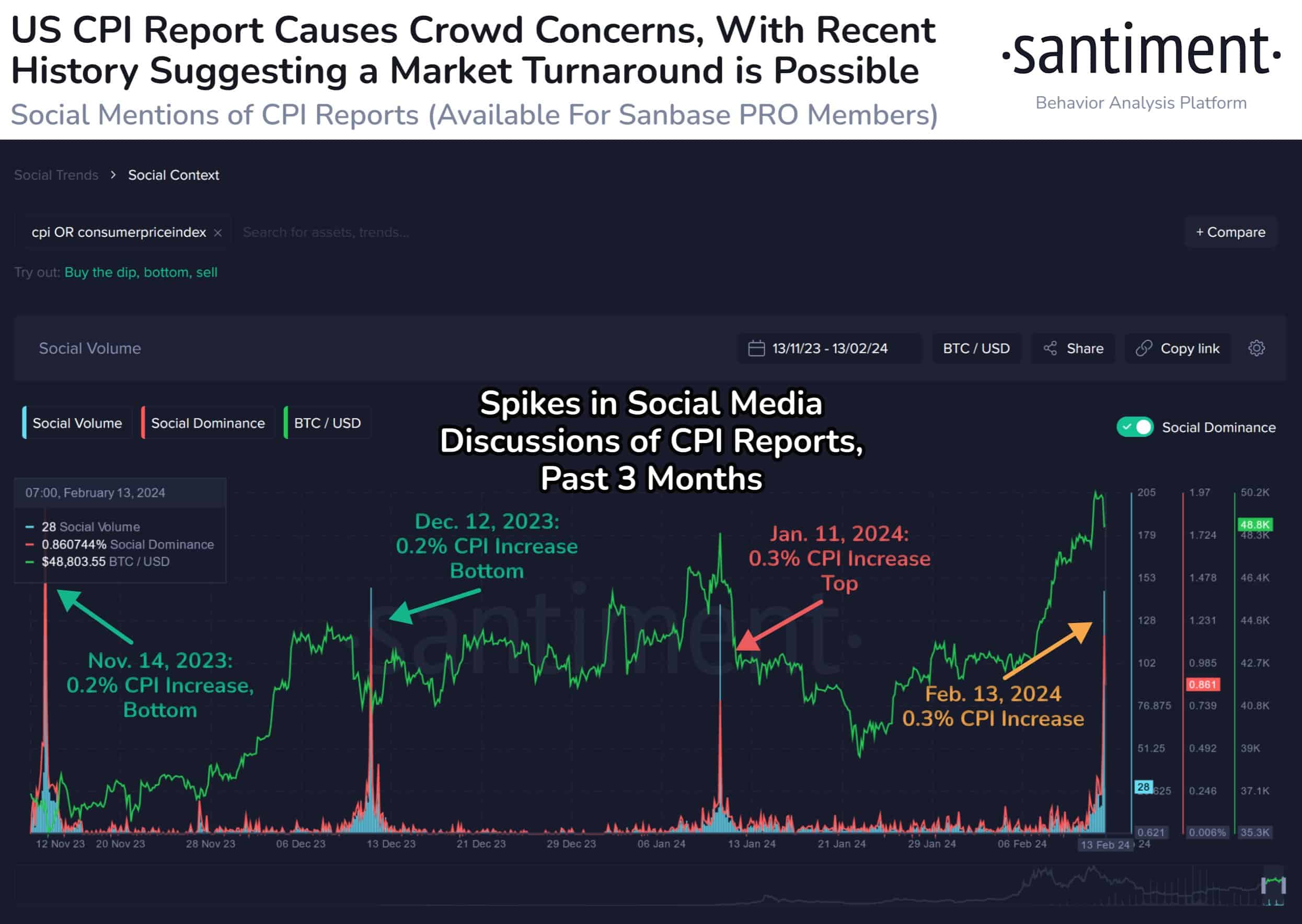 However, Santiment highlights an interesting trend, noting that the previous three months’ Consumer Price Index (CPI) reports have all coincided with significant mid-term turnarounds in the crypto market. This historical pattern suggests that despite short-term fluctuations, there may be broader market shifts on the horizon