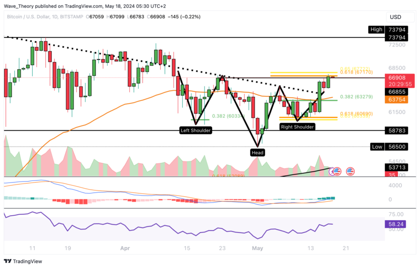 The Bitcoin (BTC) price has reached the critical golden ratio resistance at around $67,500. BTC has been up roughly 10% in the last four days.