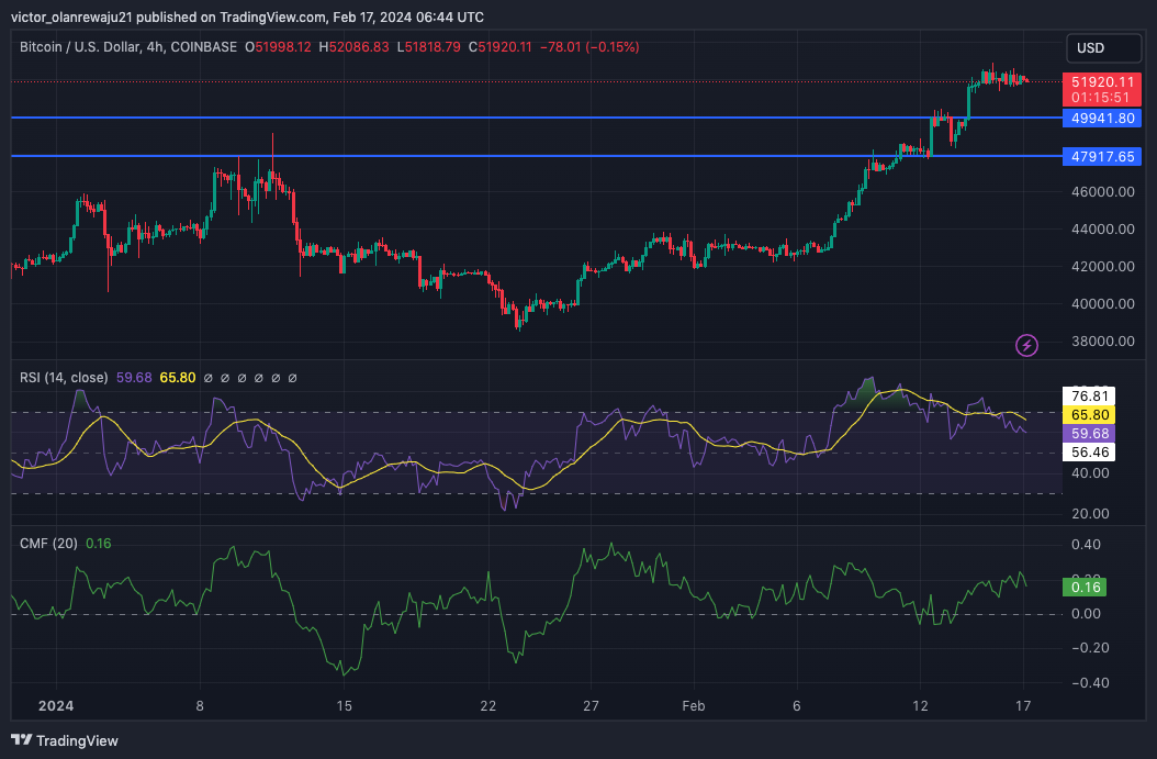 In the same vein, intense profit-taking has not occurred. If BTC remains closer to $52,000, there is a chance that the coin might break the resistance. As of this writing, the Relative Strength Index (RSI) was 59.68.