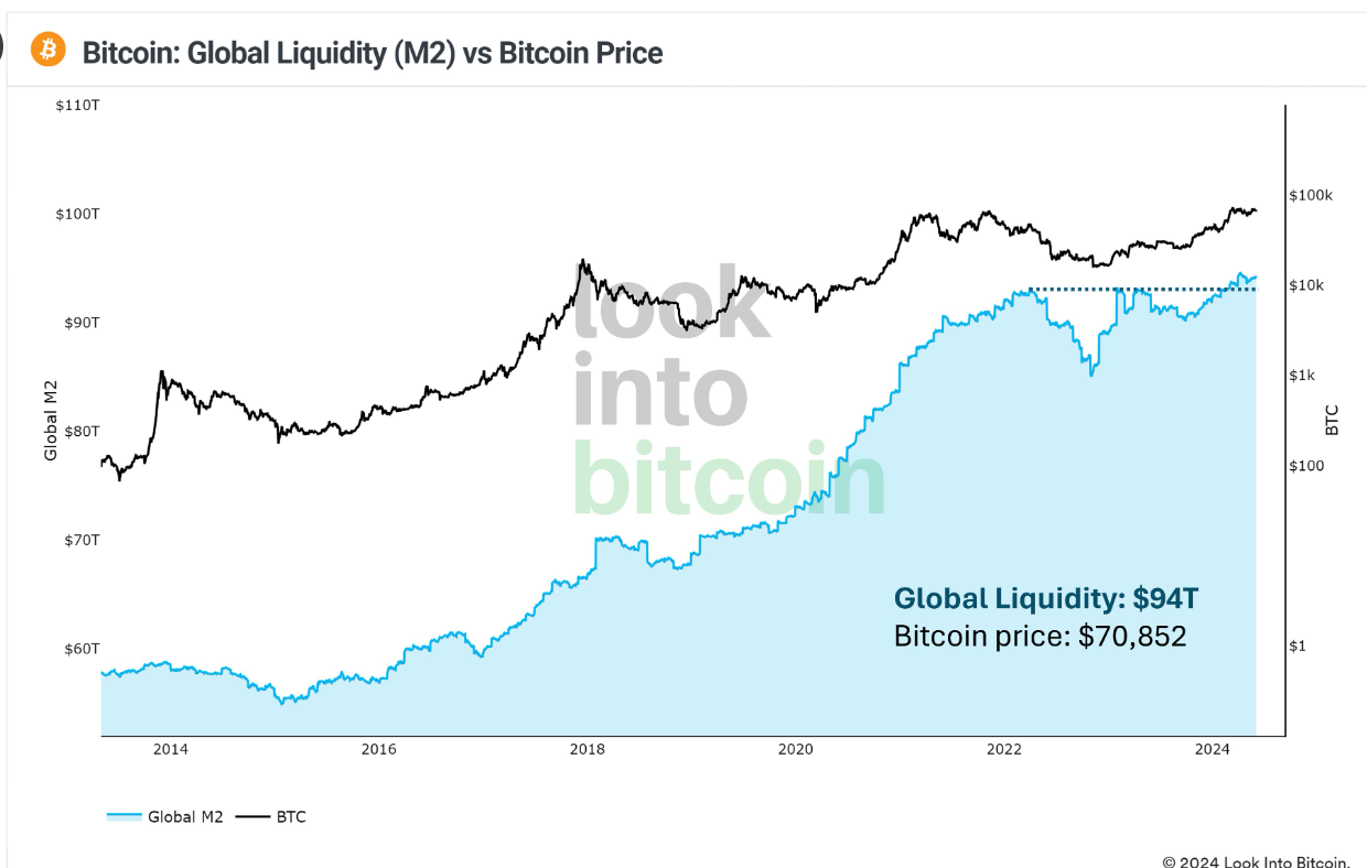 This record in global liquidity suggests a strong correlation between increased liquidity and Bitcoin’s price trajectory, indicating that the surge in M2 money supply could further fuel Bitcoin’s bullish momentum.