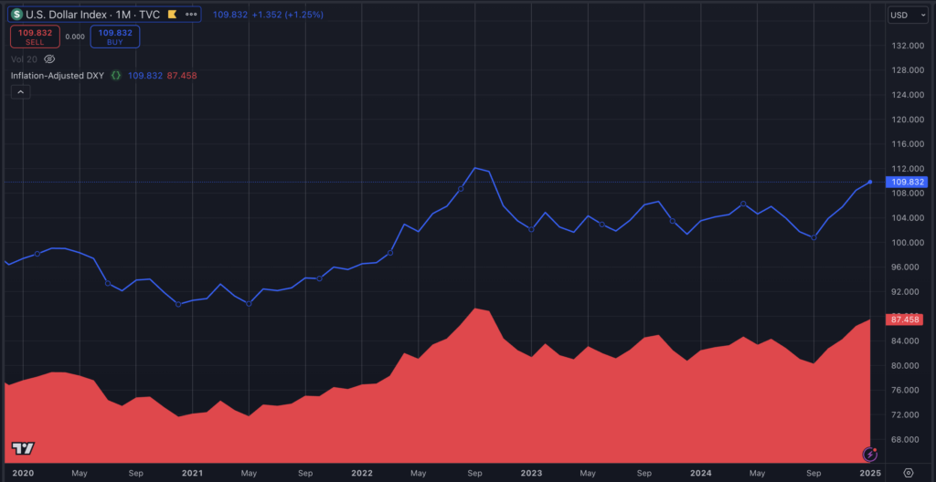 The nominal DXY currently stands at 109.8, reflecting global demand for the dollar amid macroeconomic uncertainty. However, when adjusted for cumulative US inflation since 2020—averaging over 2% annually and peaking above 8% in 2022—the real value of the DXY drops to 87.5. This represents a 22.3-point difference, or roughly 20.3% of the nominal value, illustrating the dollar’s substantial loss of purchasing power over time despite its relative strength against other currencies.