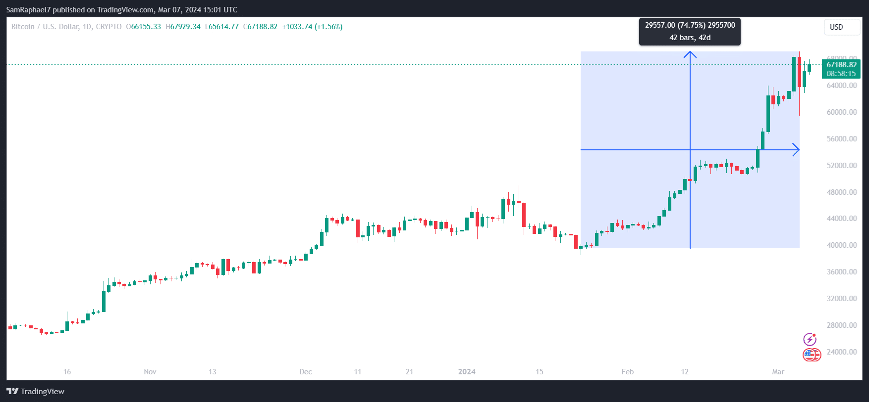 Bitcoin has leveraged a confluence of increased demand from the spot Bitcoin ETFs and bullish sentiments to print a massive market run. The crypto asset rallied 74% from a price of $39,541 on Jan. 23 to an all-time high of $69,098 on March 5.