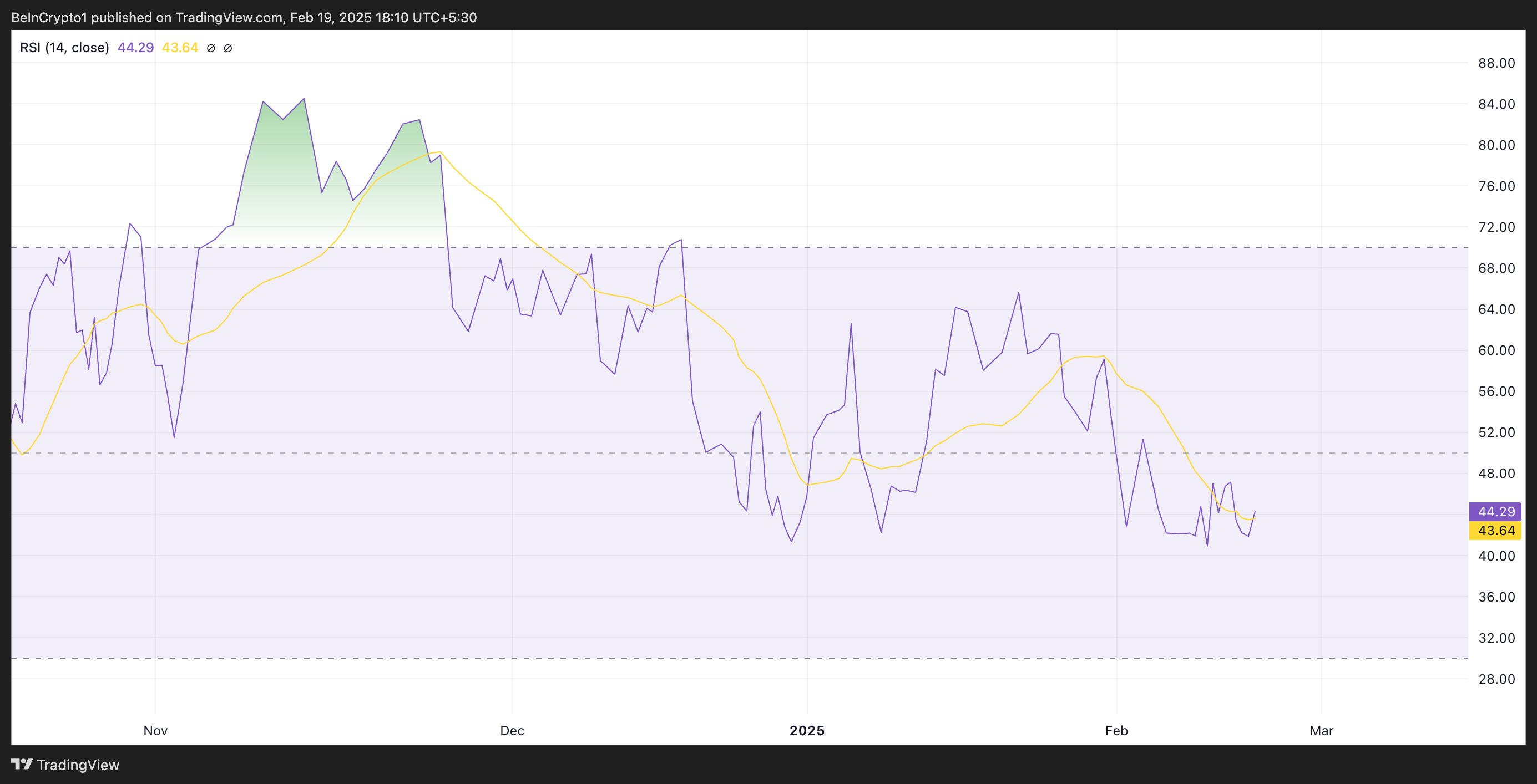 At 44.29, BTC’s RSI suggests that selling pressure is stronger than buying momentum but not yet at oversold levels. This means there is room for further downside or potential consolidation before a trend shift.