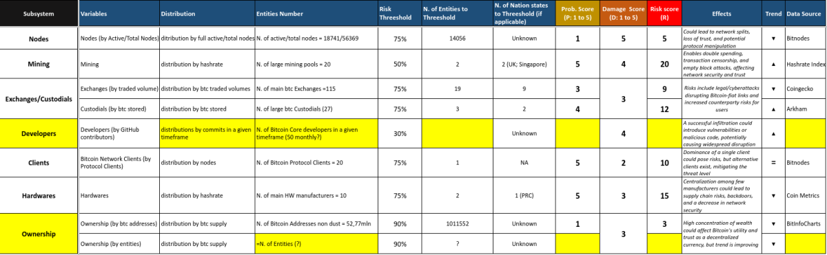 Given this non-exhaustive overview of the various subsystems of Bitcoin and their vulnerabilities, we can endeavor to synthesize the six dimensions into a single table. This table would measure the risk of centralization as a matrix between probability (P) and damage incidence (D, meaning the relevance of effects on the network), illustrating the dynamics toward increasing or decreasing centralization.