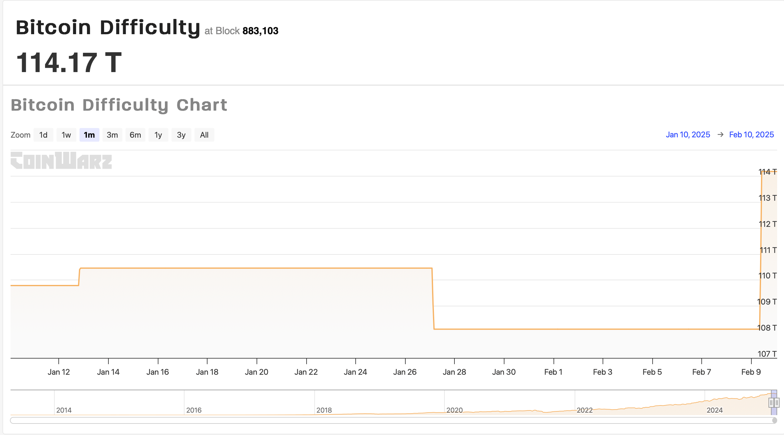 Bitcoin’s computational difficulty leaped by 5.61% at block height 883,008, catapulting its measure to a historic peak of 114.17 trillion, as per the latest network analytics.