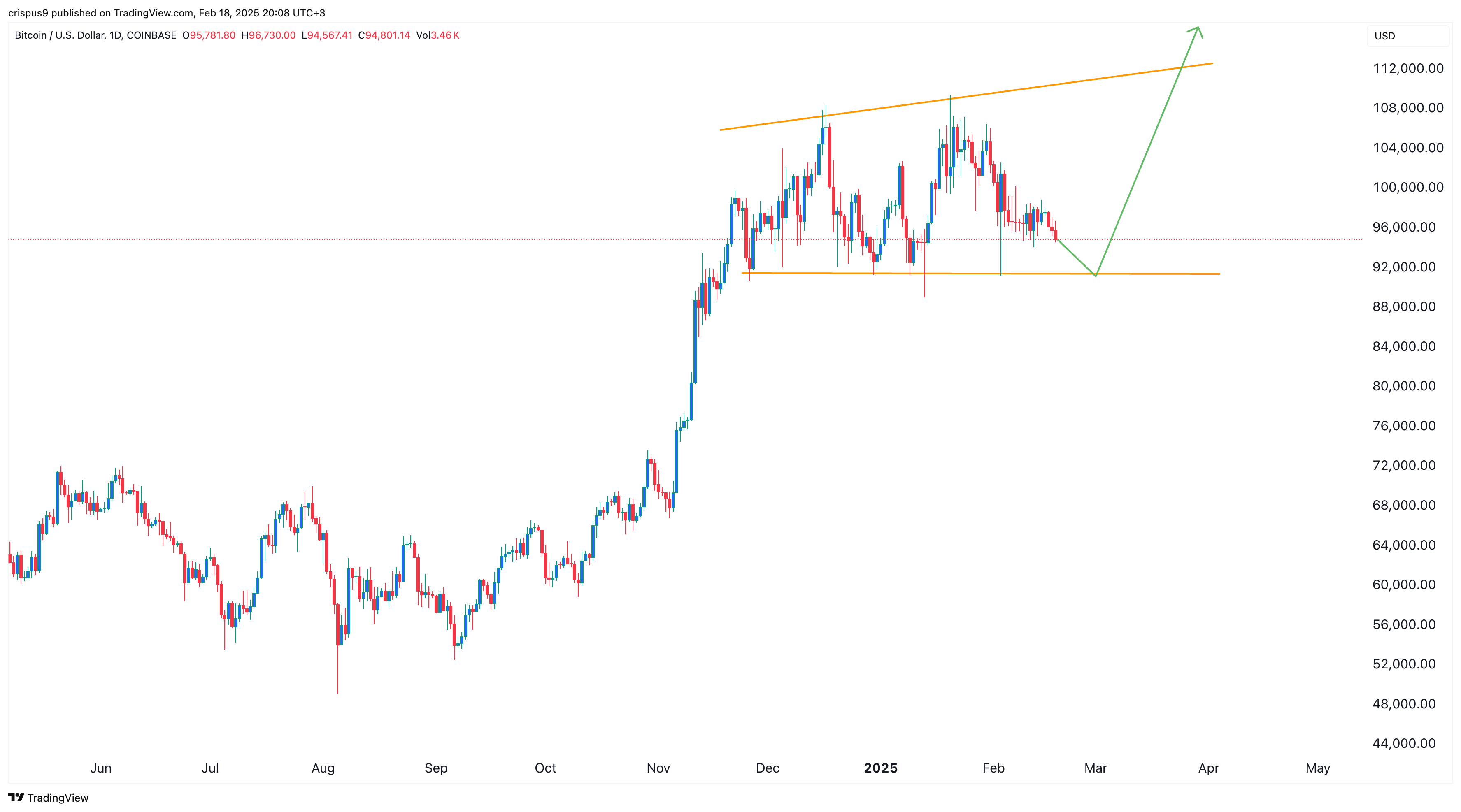 Notably, Bitcoin has formed a megaphone chart pattern, a popular bullish indicator. This pattern consists of two diverging trendlines and typically precedes a strong breakout after retesting the lower side of the channel.