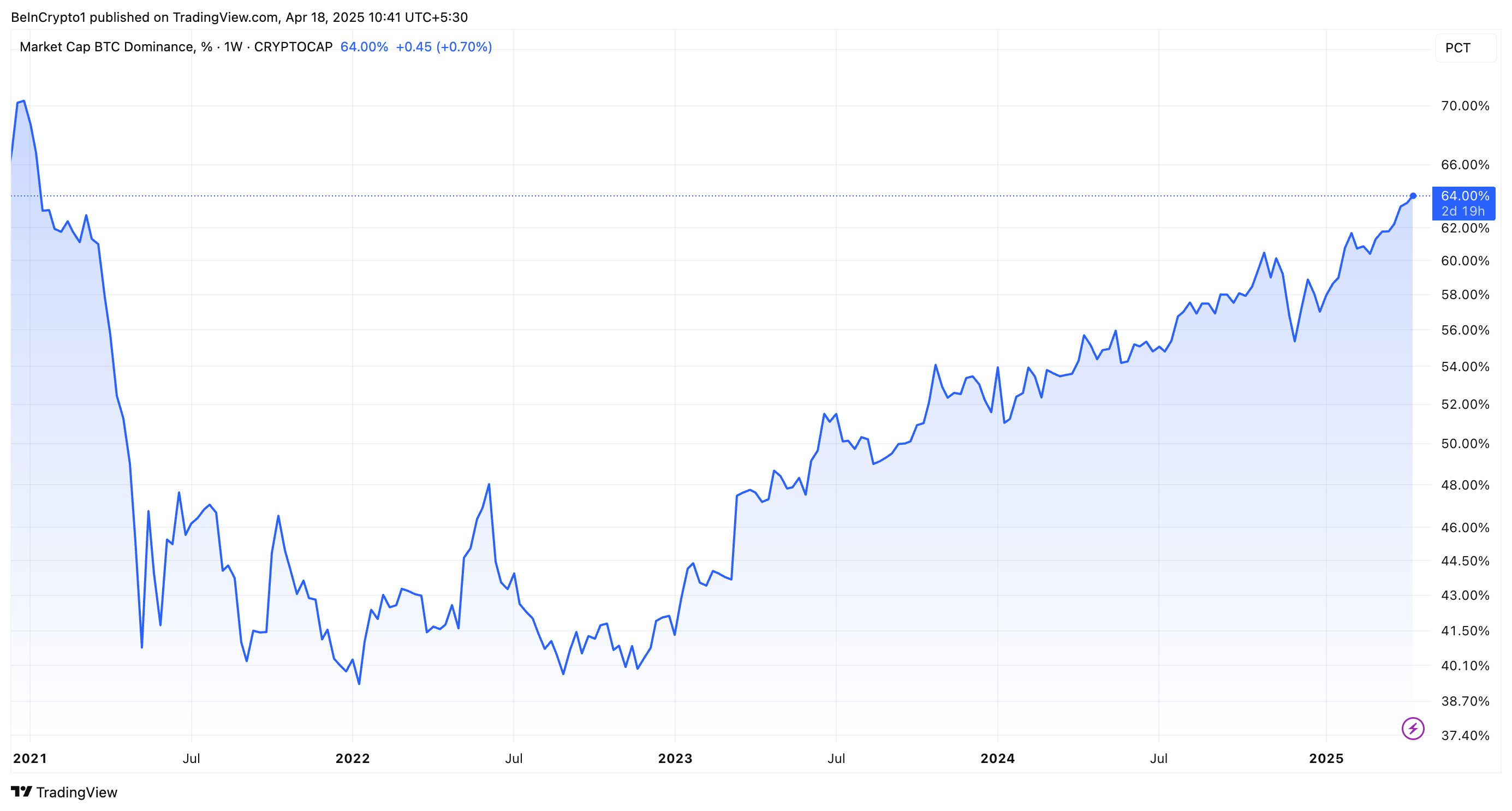 Bitcoin’s (BTC) market dominance has surged to 64%, reaching its highest level in over four years.