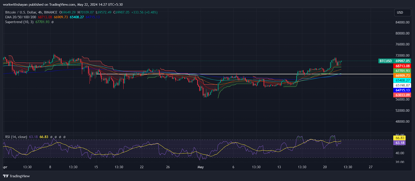 The rising 20-day EMA ($68,714) and the RSI below the overbought territory suggest an upward trend. If Bitcoin surpasses $74,000, the BTC/USDT pair could target $80,000, where significant selling pressure from bearish traders may occur.