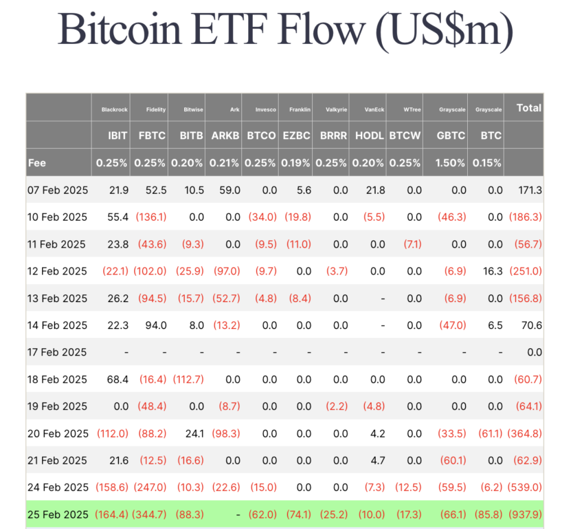 Data on Farside Investors and Trader T’s analysis show that Bitcoin ETF net outflows reached $937 million on Tuesday. Fidelity’s FBTC led these outflows with $344 million, followed by BlackRock’s IBIT at $164 million in redemptions.