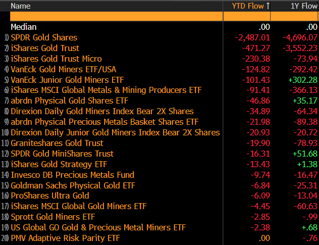 Historically considered a safe haven asset, Gold has experienced significant outflows from its ETFs. Bloomberg’s chart shows a downward trend, with roughly $3 billion outflows from various gold ETFs YTD and approximately $9 billion over the past year. Specifically, SPDR Gold shares and iShares Gold Trust witnessed about $2.5 billion and $500 million outflows YTD, respectively, with gold prices dropping 3% YTD.