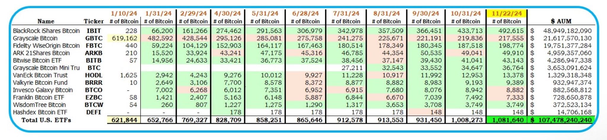 As of November 23, Bitcoin ETFs in the US reached $107 billion in assets, which represents around 86% of the total net assets of gold ETFs, according to data combined by Balchunas and HODL15Capital.