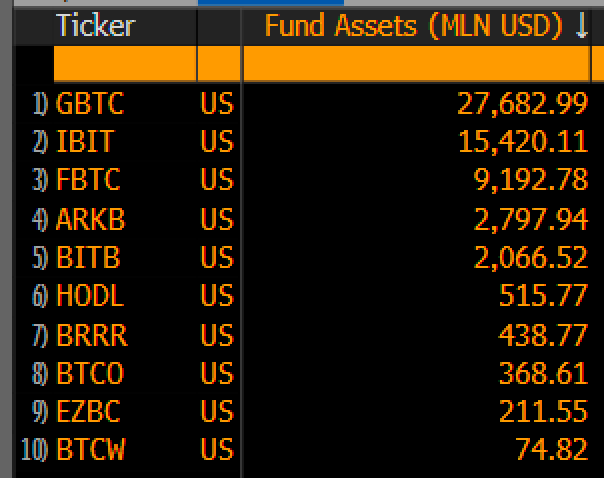 The Bloomberg terminal data shared by Balchunas reveals that leading the pack are Grayscale’s GBTC, BlackRock’s IBIT and Fidelity’s FBTC, with assets under management reaching $27.68 billion, $15.42 billion and $9.19 billion, respectively. These figures underscore the significant market share held by these established players in the Bitcoin ETF landscape.