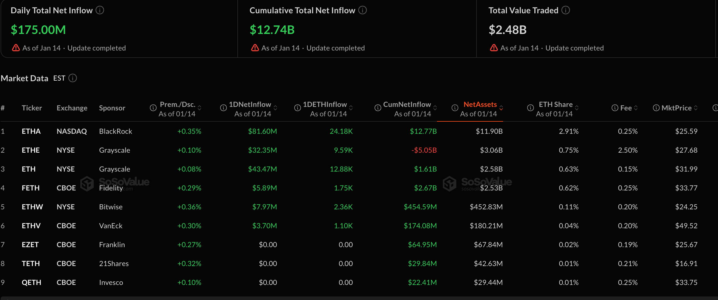 Ether-linked funds also saw steady demand. Spot ether ETFs recorded $175 million in net inflows on the day, led by BlackRock’s ETHA and Grayscale products, extending a gradual recovery in flows after a quiet December.