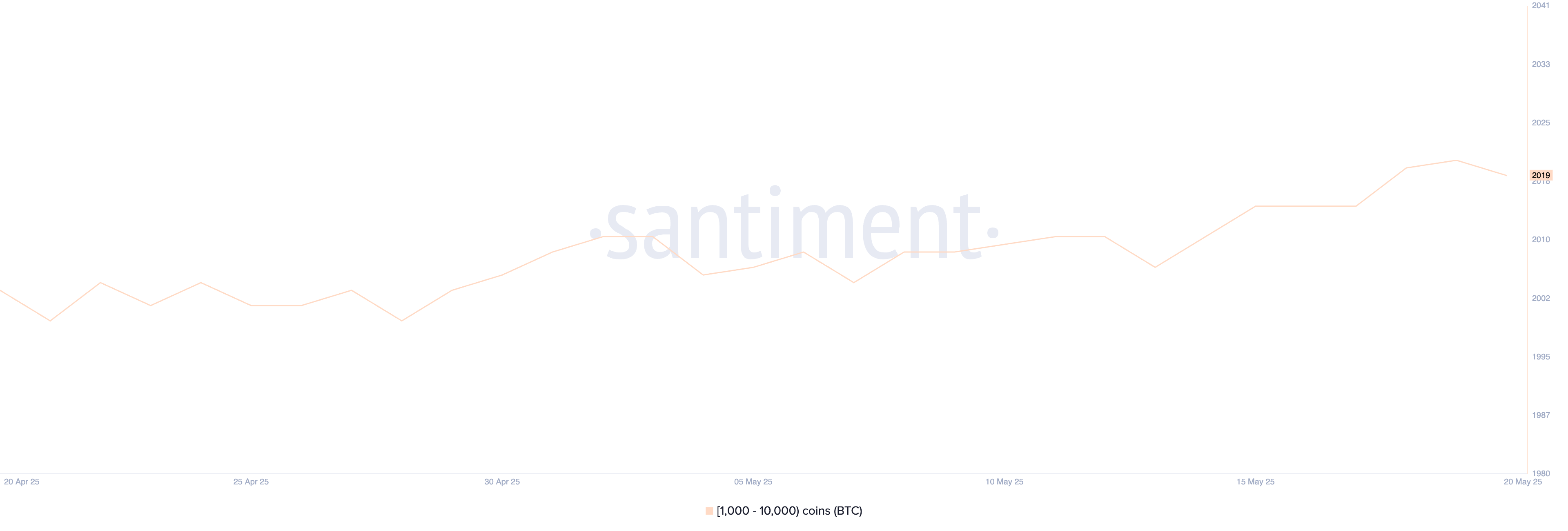 The number of Bitcoin whales—wallets holding between 1,000 and 10,000 BTC—increased from 2,007 to 2,021 between May 13 and May 19, before slightly dipping to 2,019 yesterday.