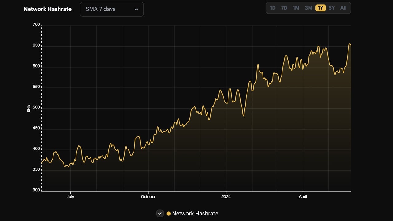 Bitcoin hashrate via the seven-day SMA on May 28, 2024.