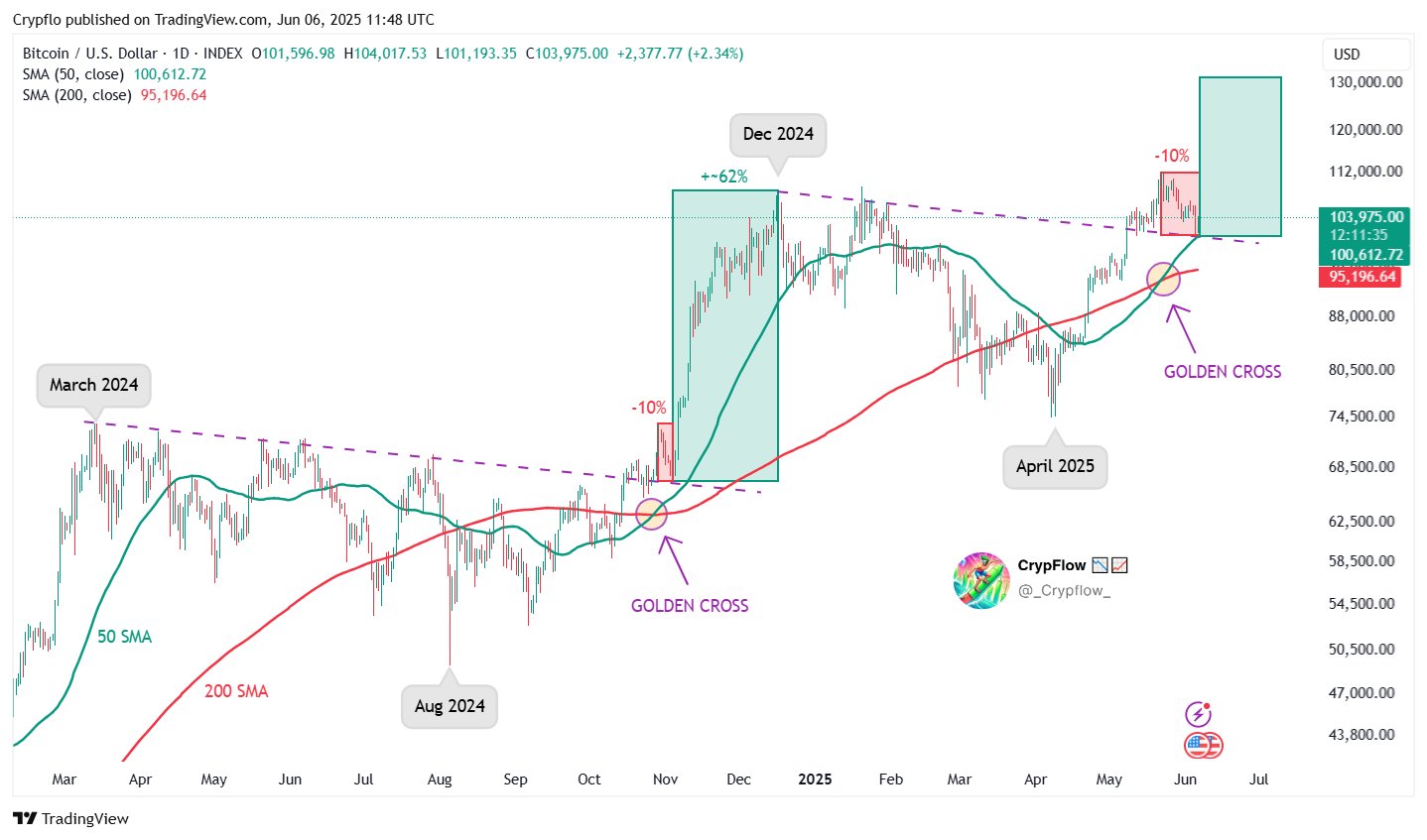 CrypFlow’s analysis suggests that if Bitcoin is repeating its price rally from Q4 2024, the premier cryptocurrency could produce a 62% price gain translating into potential targets around $170,000. However, the analyst has set a more conservative initial price target of $130,000, representing a 25% gain from current market levels.