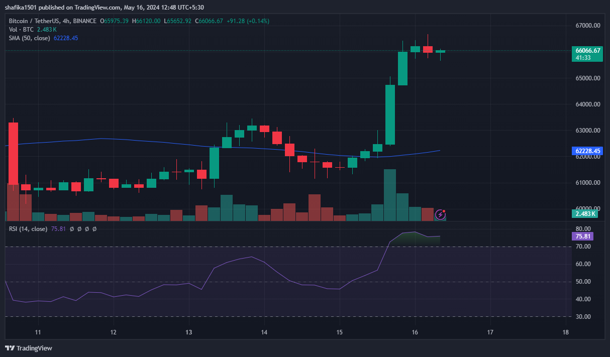 The price of Bitcoin has kindled optimism in the market by drawing in waves of upsurge since yesterday. The leading cryptocurrency crossed over the $61K mark, revisiting its bullish trends from late April. After sustaining around the $61K-$62K range for days, the prices climbed steadily on May 15 finding support at a new weekly high of $66,677 in the early hours of May 16.