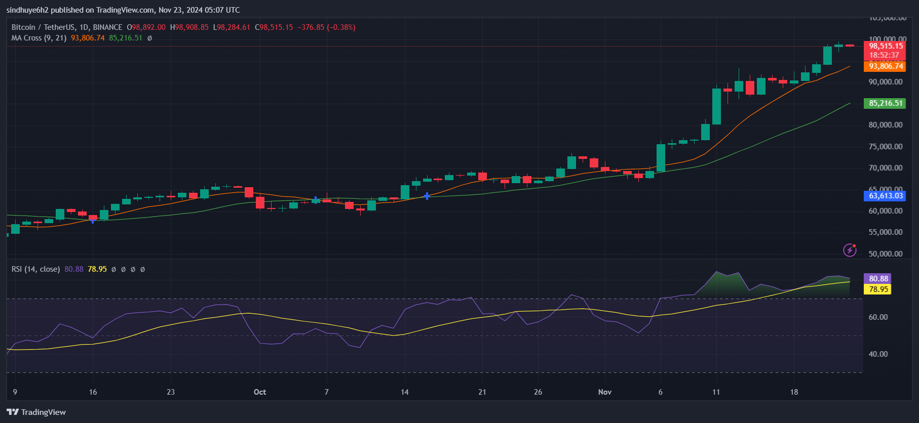 The chart also highlights a bullish crossover of the 9-day and 21-day moving averages. This crossover indicates continued upward momentum, reinforcing the bullish outlook for Bitcoin.