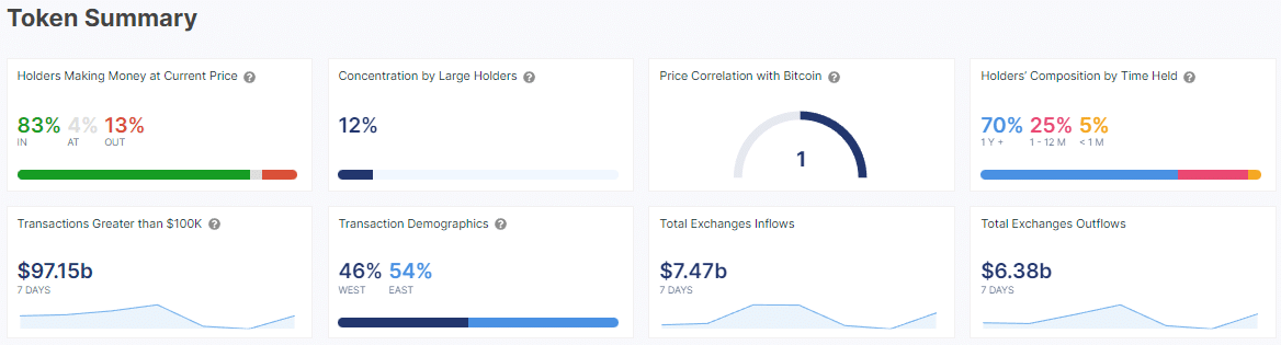 Elsewhere, IntoTheBlock’s data show 83% of Bitcoin holders are in profit, while only 13% are experiencing losses. Large holders, or “whales,” possess 12% of Bitcoin, indicating a significant concentration of wealth.