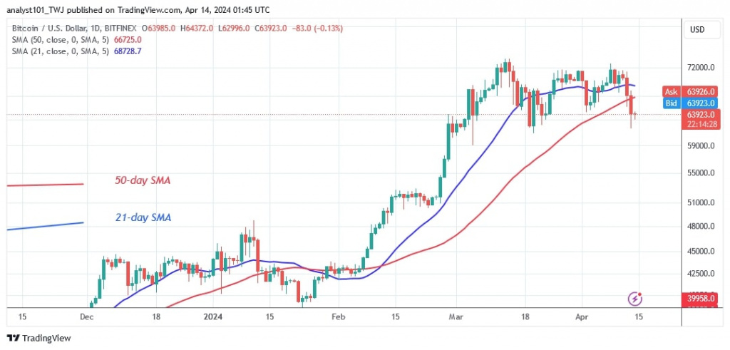 Bitcoin is now falling below the moving average lines. The largest cryptocurrency fell from its previous highs at $72,000 and $61,593. The bulls bought the dips, but the upside correction ended at a high of $68,000. The decline has started slightly to the downside.