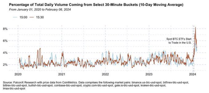 Lawant’s observations suggest that introducing Bitcoin ETFs has positively impacted market structure, decreasing volatility. The fix time, a designated time for trading activities related to ETFs, has witnessed a notable uptick in trading volumes, indicating a broader and more stabilized market.