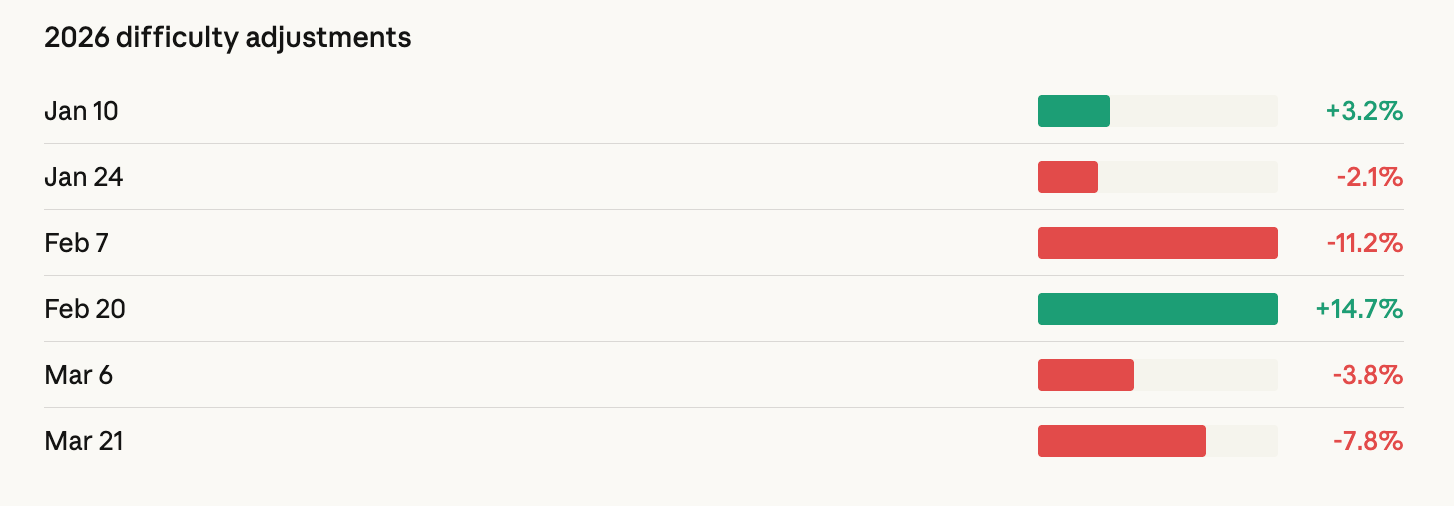 The network is already showing the stress. Difficulty dropped 7.76% on Saturday to 133.79 trillion, the second-largest negative adjustment of 2026 after February’s 11.16% plunge during Winter Storm Fern. Difficulty is now nearly 10% below where it started the year and far below November 2025’s all-time high near 155 trillion.