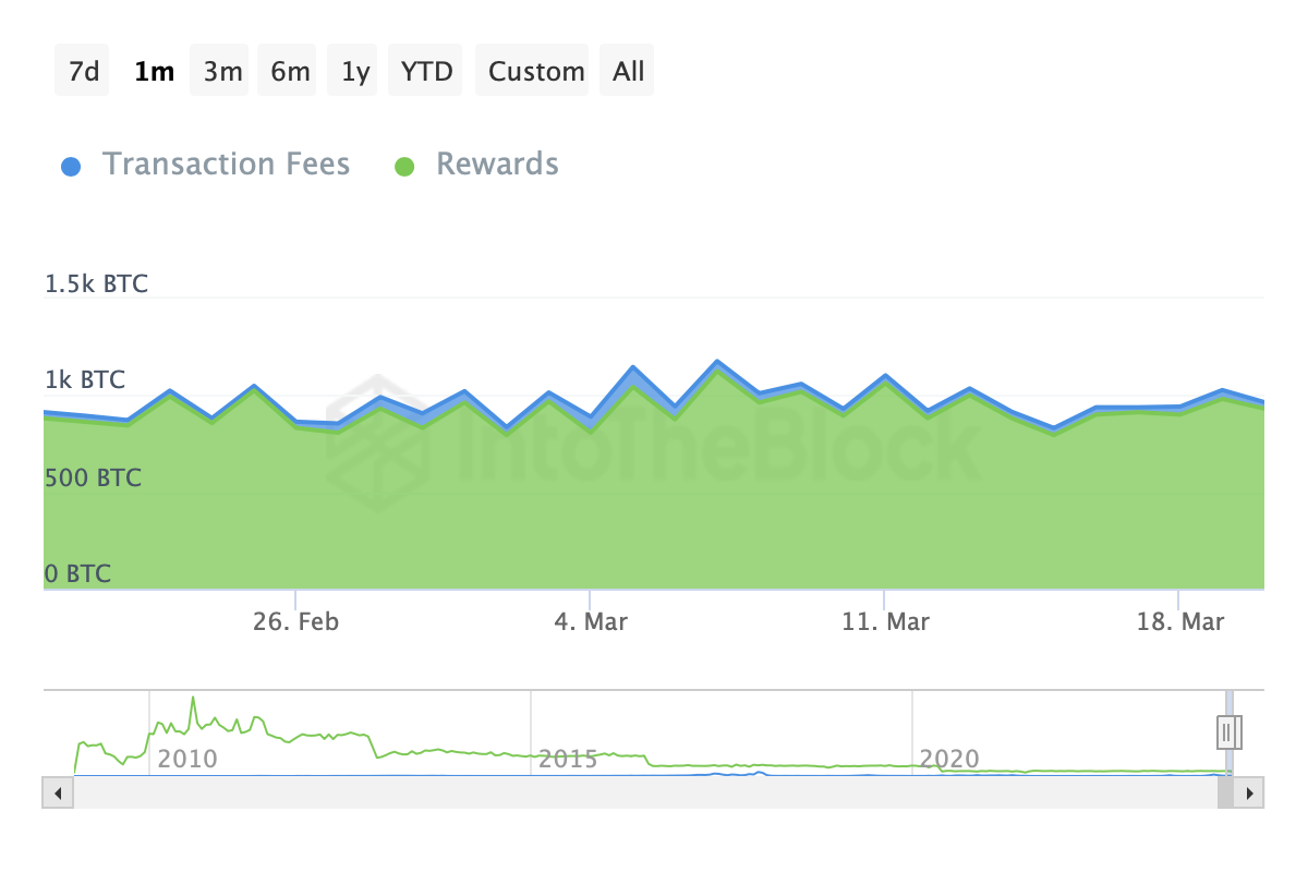 Bitcoin miners obtained more fees at the start of March. Source: intotheblock.com.