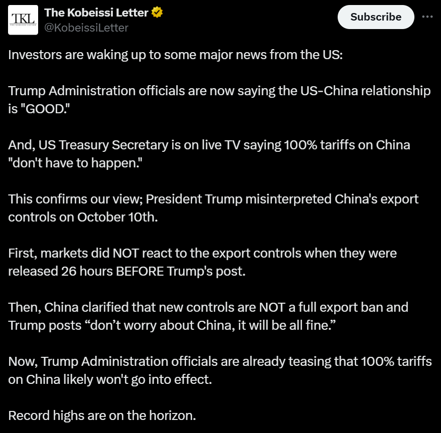 “This confirms our view that President Trump misinterpreted export controls announced on October 10th,” market commentator The Kobeissi Letter wrote, referring to China’s expansion of export restrictions on rare earth minerals for defense and semiconductor industries.