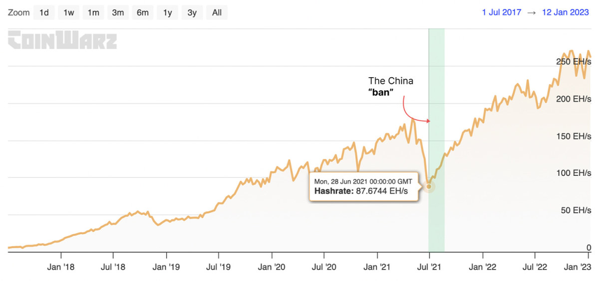 The New York Times then reported a “ban” in China in September 2021, citing this policy disclosure from the Chinese Government (more on that later), even though that same month, publicly available data from Cambridge showed that mining activity had already bounced back to 22.3% of global hashrate.
